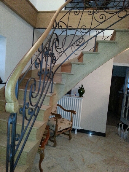 départ d'escalier à l'anglaise ,marches en arrondi ,avec ferronnerie décor floral (64)